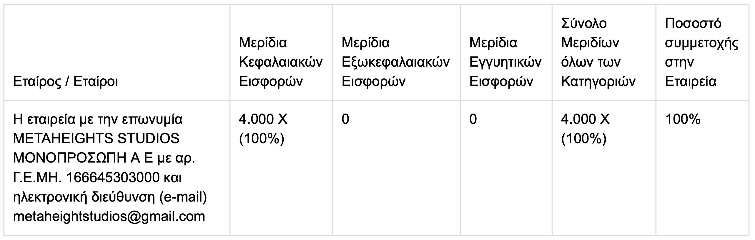 [email protected] κατέβαλε 40.000,00 ευρώ μετρητά και έλαβε 4.000 εταιρικά μερίδια, ονομαστικής αξίας 10,00 ευρώ έκαστο.